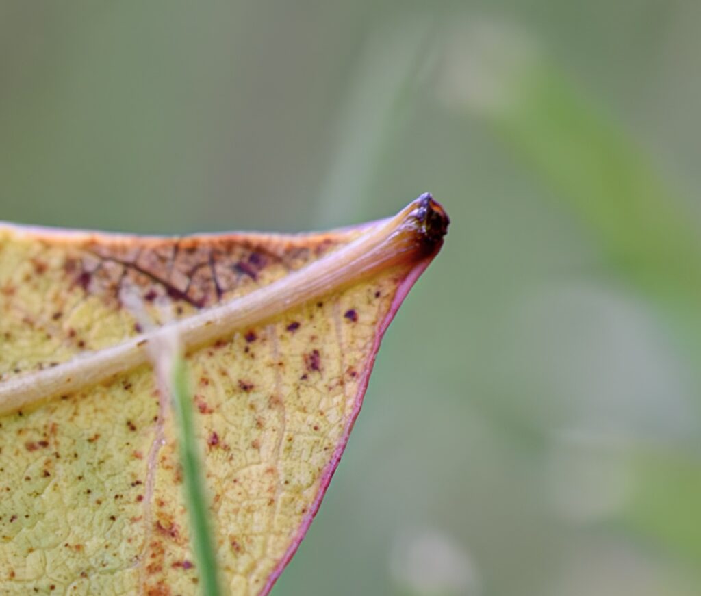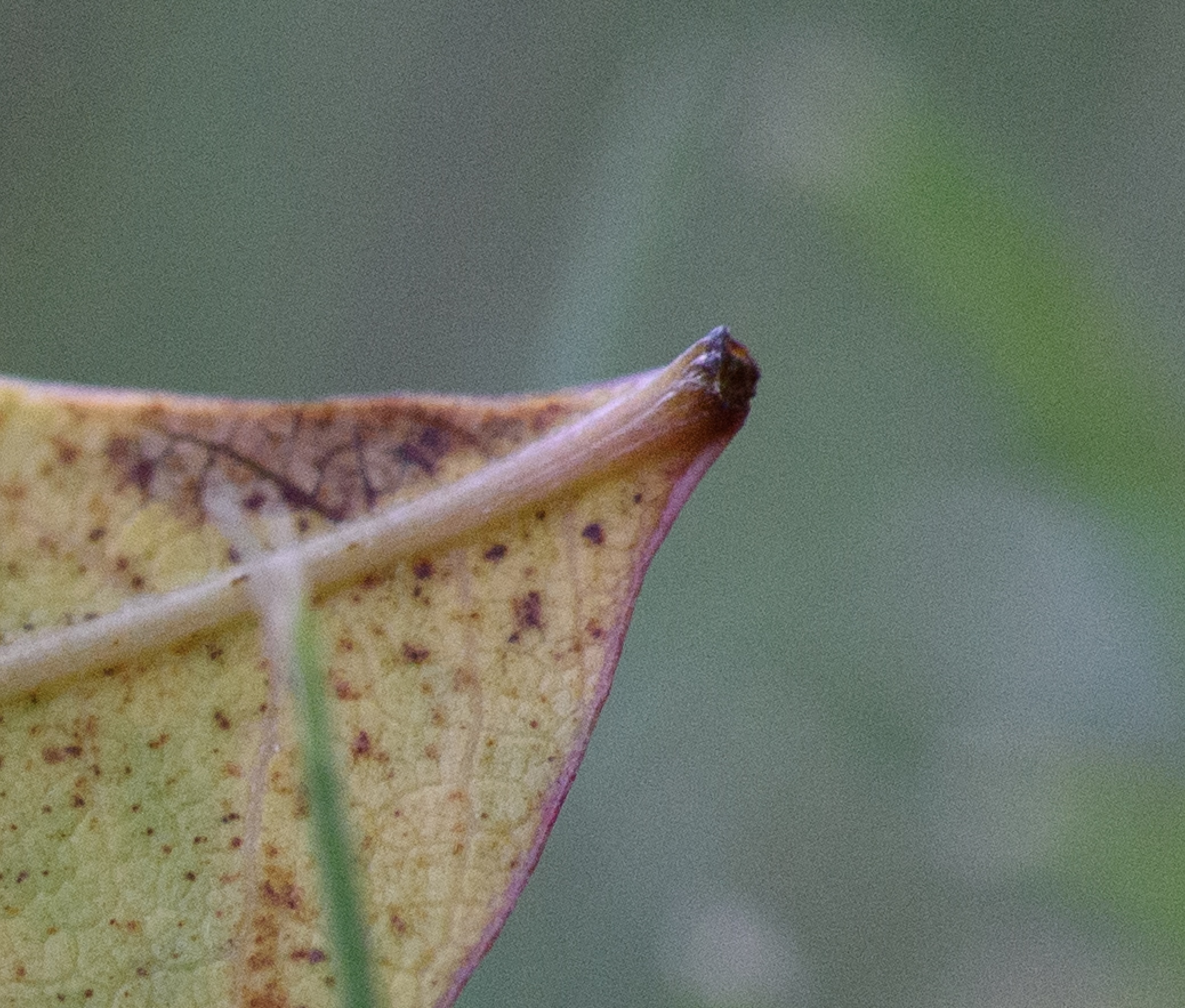 I squatted down on the somewhat soggy grass, put my camera in Live View, flipped up the screen just a bit, dialed in an aperture of f/11 with minimum shutter speed of 1/180 second, and fired off a couple of shots. (My aging D750, as I have written about before, still stands toe-to-toe with any modern camera in terms of straight-up image quality, but when it comes to composing in Live View…well, let’s just say it’s pretty outdated. It works great if the subject is still though, which this leaf most certainly was.) This one ended up as my favorite from the bunch: the leaf is sharp, detailed, and stands out from the foreground and background. It even has a cool purple fringe on the lower portion which is not, as one might assume, an optical artifact from light bouncing around in the lens, but just the natural color of the leaf as it withers away.